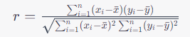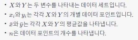 Pearson 상관계수는 -1과 1 사이의 값을 가지며, 다음과 같이 계산됩니다: