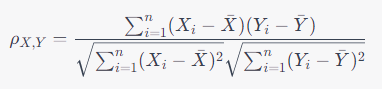 피어슨 상관계수는 두 변수 간의 선형 관계를 측정합니다. 주로 연속형 변수 간의 상관 관계를 계산하는 데 사용됩니다. 공식은 다음과 같습니다: