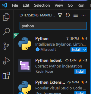 2. Extensions에서 python을 검색하고 설치한다.